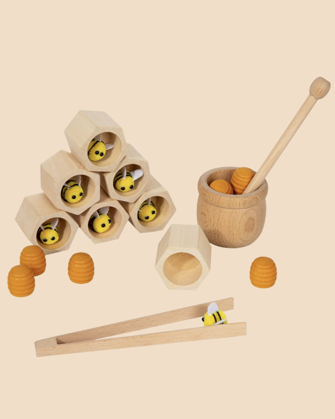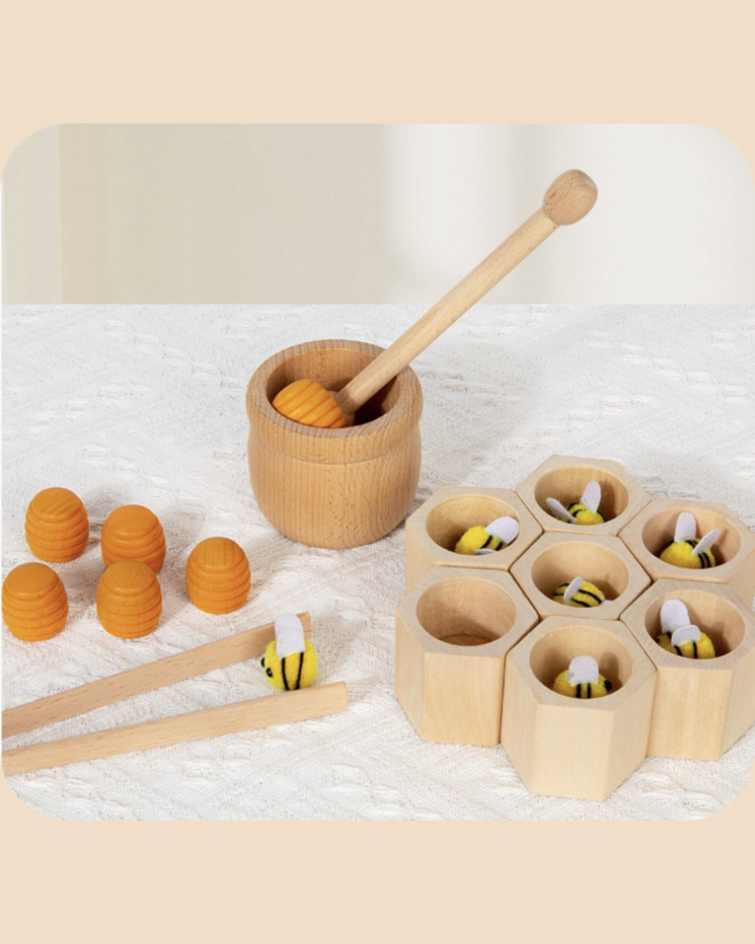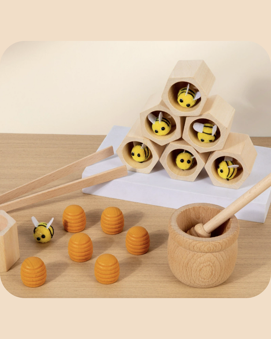 We kiezen voor stevig, naturel hout met een zachte afwerking. De tang is licht genoeg voor kleine handjes, maar stevig genoeg om echt te spelen. De bijtjes zijn lief beschilderd - elk bijtje met z'n eigen geel-zwarte streepjes. De honingraat is hexagonaal (net echt!), met vakjes waar de bijtjes precies in passen. En het honingpotje met de lepel? Pure extra magie voor fantasiespel. Het is een set die jarenlang meegaat, die uitdaagt én ontspant. 🐝
