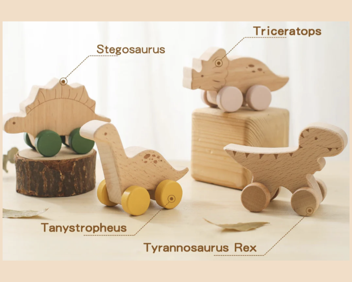 Inclusief: 4 houten dinosaurussen op wieltjes