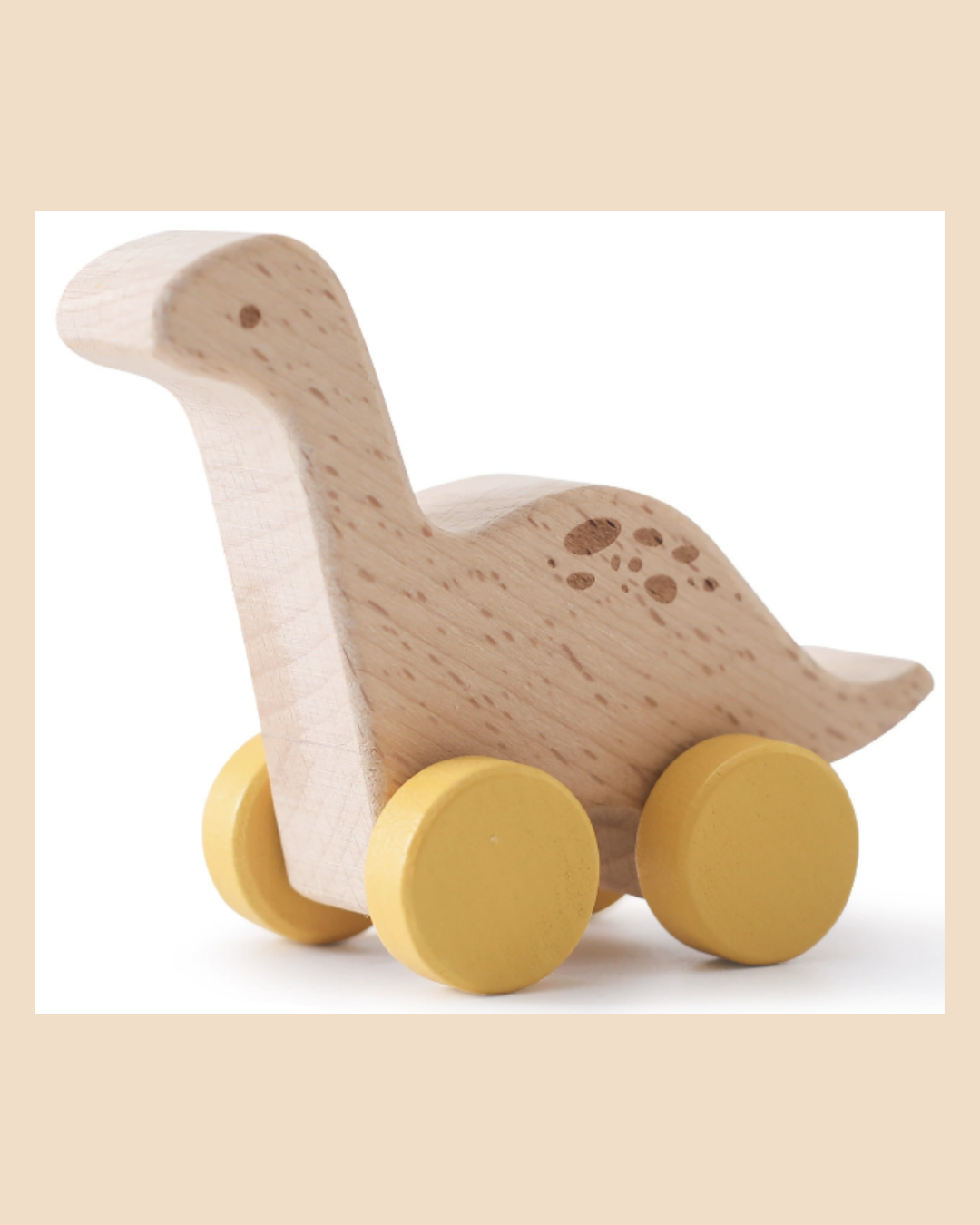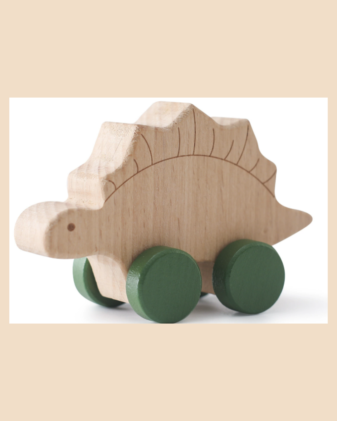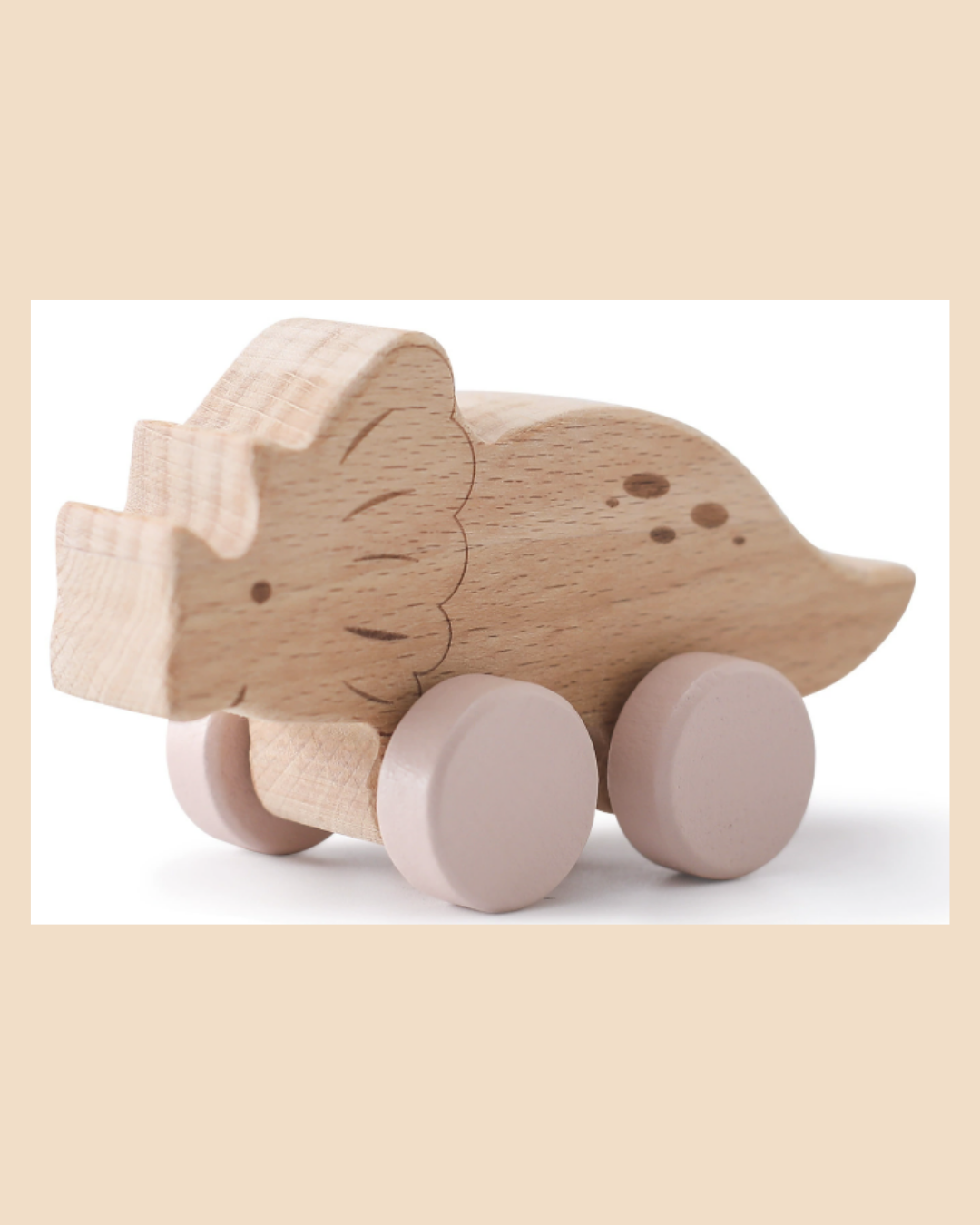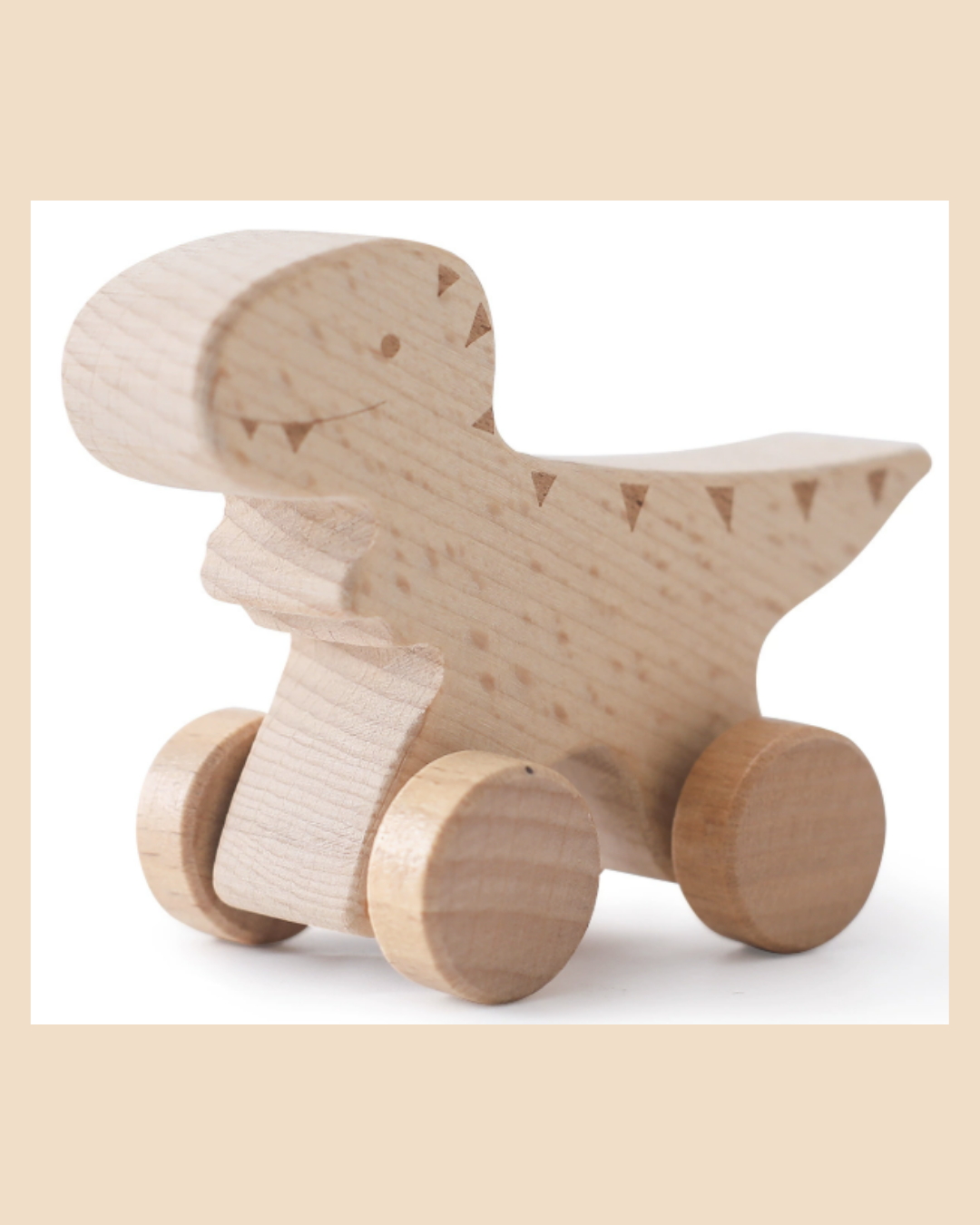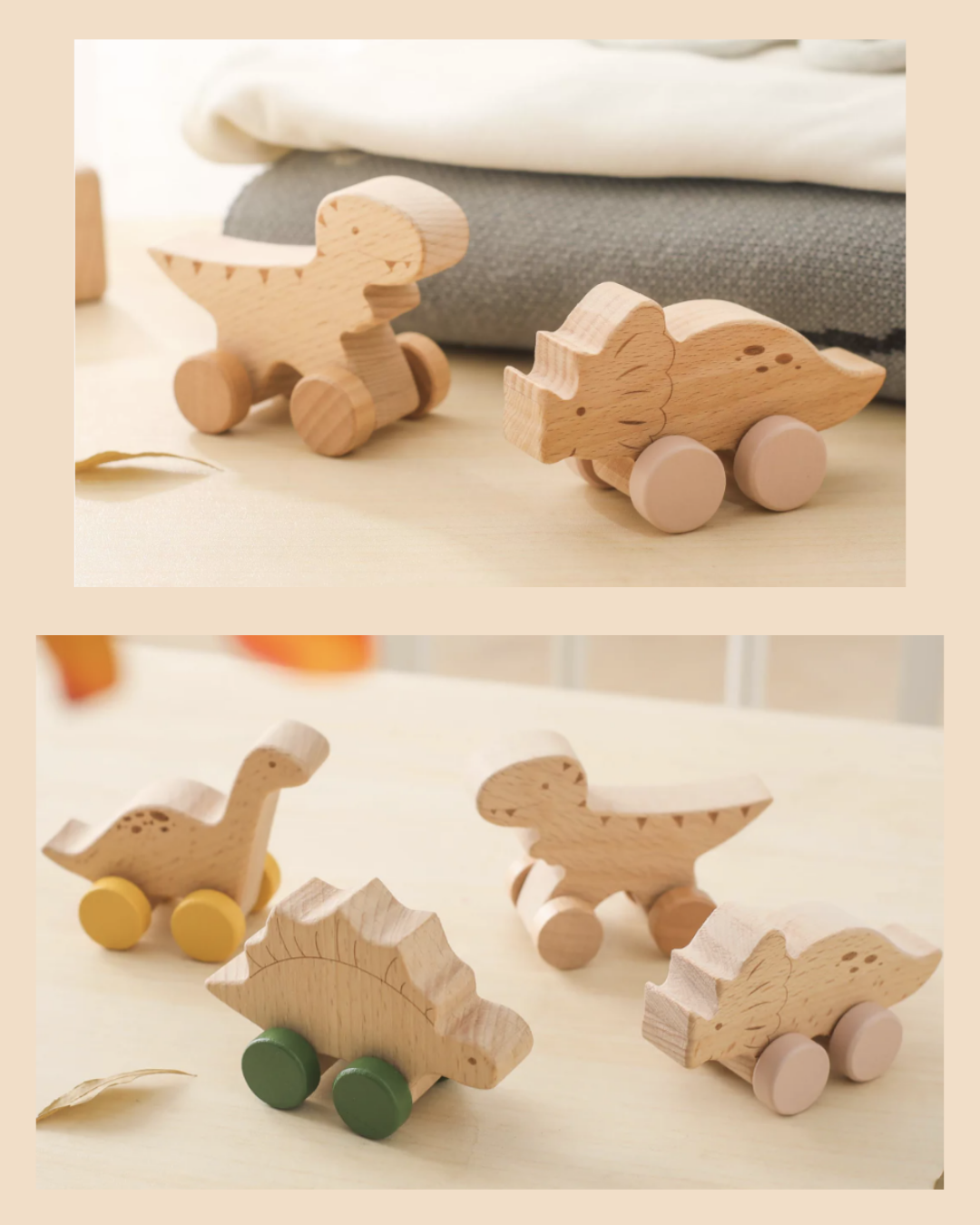 Het mooiste? Het natuurlijke hout voelt warm aan. De wieltjes in verschillende kleuren maken elke dino herkenbaar. En omdat ze handgemaakt zijn, is jouw setje uniek - de houtnerf, de kleurnuances, allemaal net iets anders. Dat maakt ze extra speciaal.