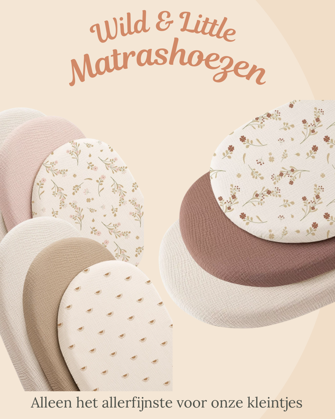 We kiezen voor 100% puur katoen zonder toevoegingen - geen polyester-mix, geen "easy care" chemicaliën, gewoon eerlijk katoen. Het weefsel is soepel, rekbaar, zacht als een T-shirt. Het elastiek rondom is stevig maar niet te strak - het rekt mee zonder uit te zakken. En de lakens passen om de meeste standaard baby- en peutermatrasjes (60×120 cm én 70×140 cm). We bieden ze in rustige, tijdloze kleuren en zachte prints die passen bij Wild & Little - geen felle kleuren die afleiden van slapen, maar tinten die kalmeren. 🌙