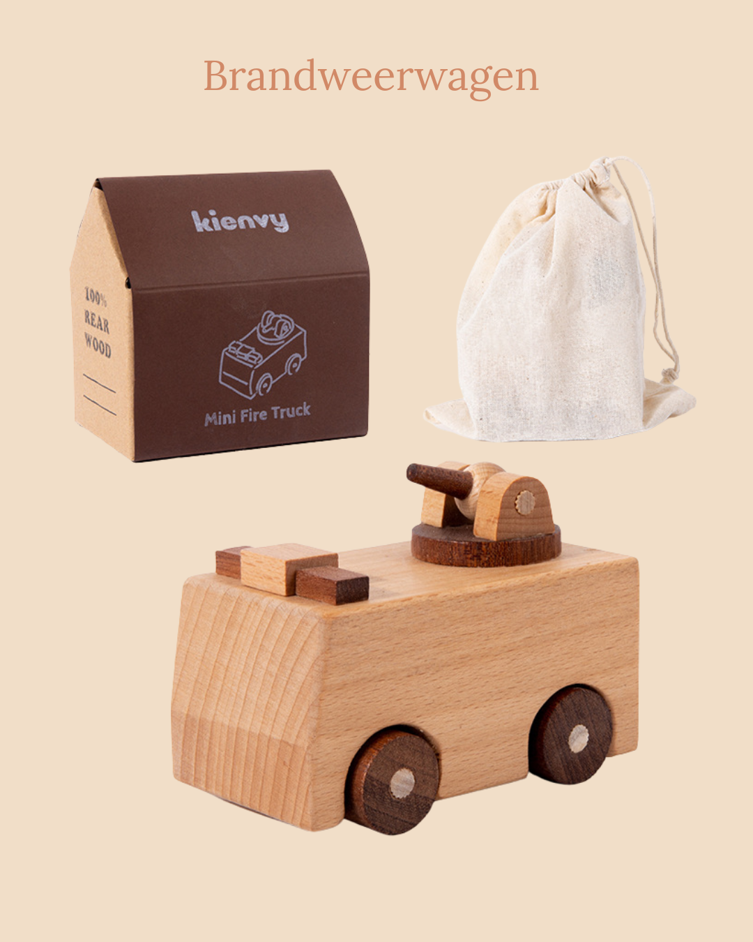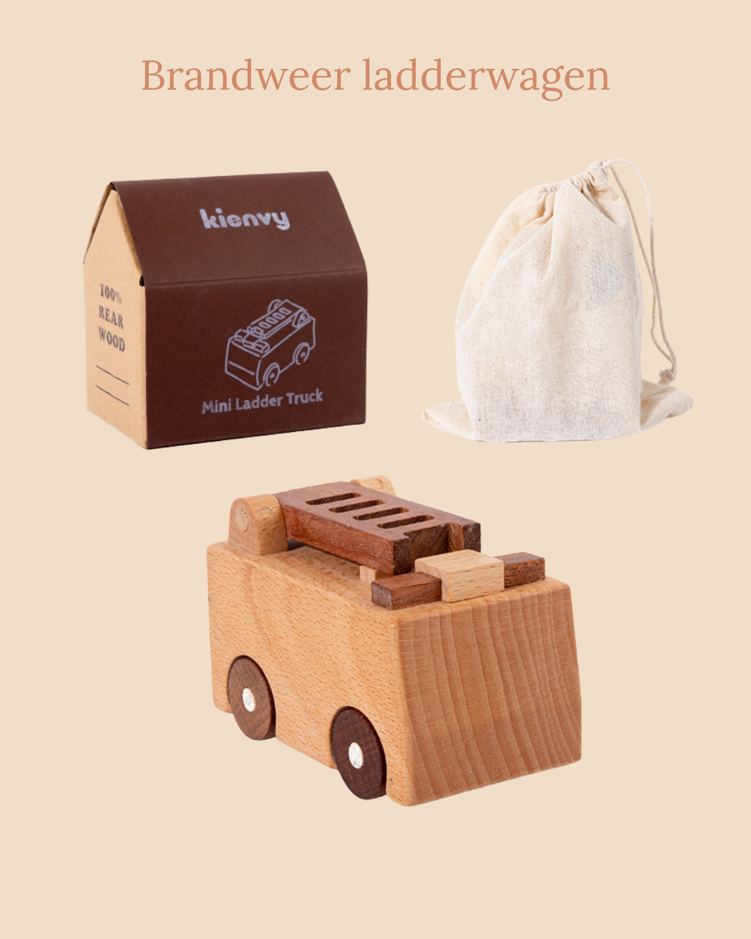 Onze Houten Voertuigen geven ze hun eigen wagenpark. Begin met één favoriet - misschien de brandweerwagen met zijn uitschuifbare ladder. Later komt de bulldozer erbij, en dan de vrachtwagen met kiepbak. Voor je het weet, is de hele vloer een bouwwerf, een stad vol hulpdiensten, een wereld vol verhalen.