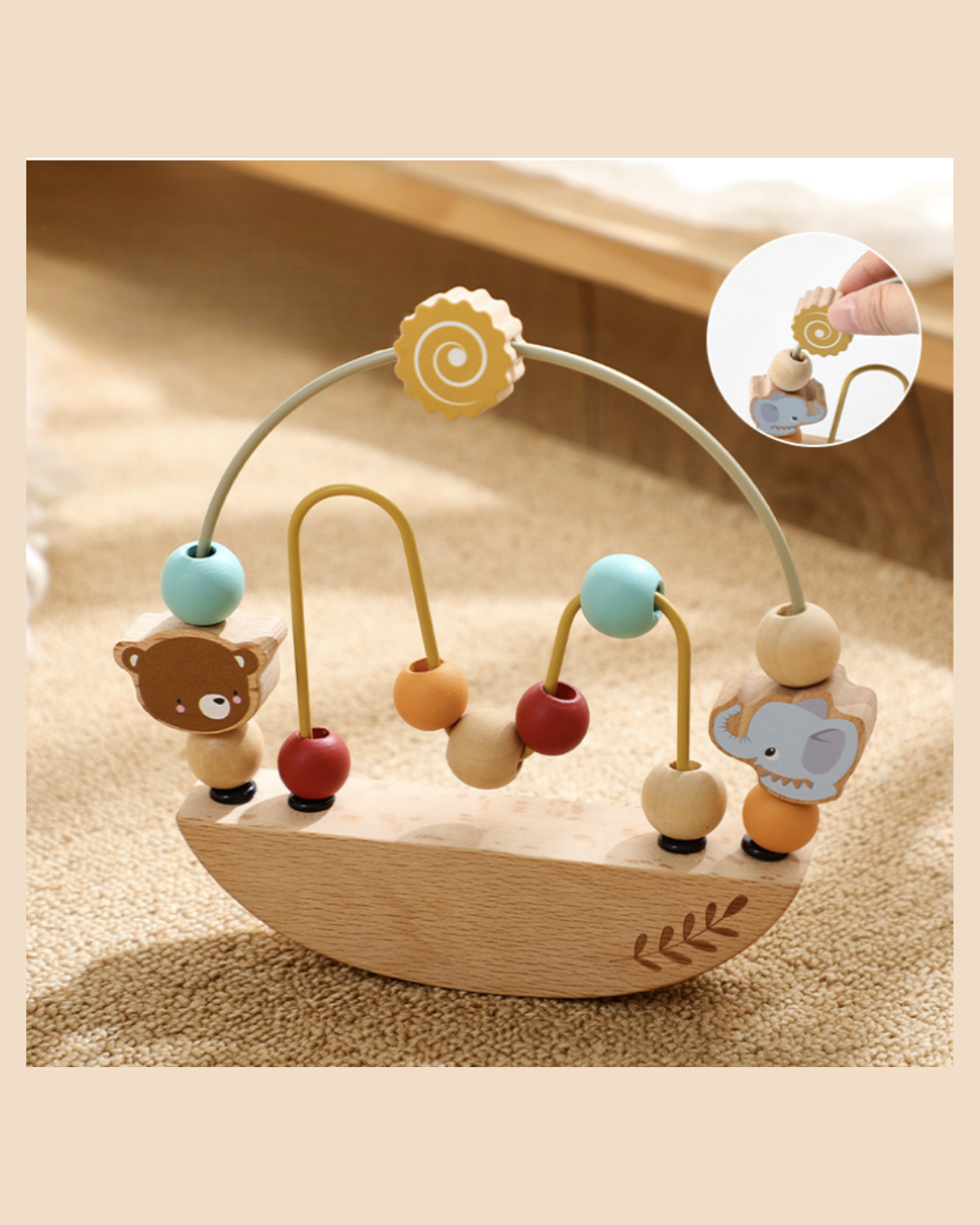 Een houten speelboog met verschillende soorten verschuifbare, houten kralen die je baby uitnodigt om te reiken, grijpen en ontdekken
