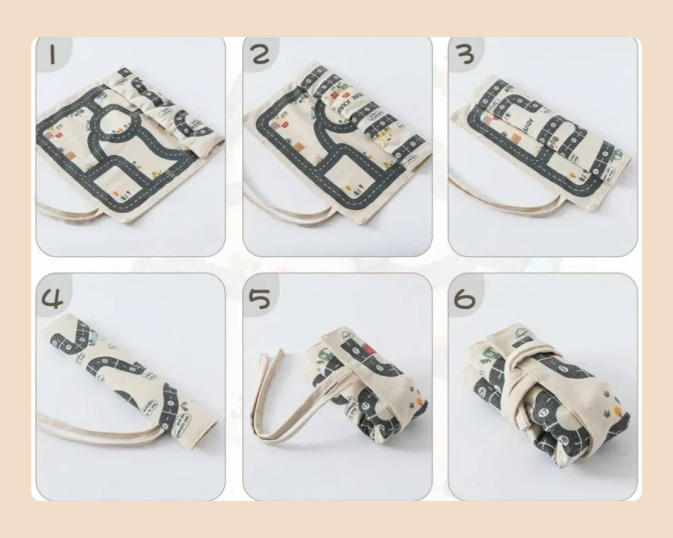 We kiezen voor stevig canvas dat een stootje kan hebben, maar toch zacht aanvoelt. De weggetjes en gebouwtjes zijn vrolijk en duidelijk gedrukt, met kleuren die niet te schreeuwerig zijn. De houten autootjes zijn gemaakt van FSC-gecertificeerd hout met kind veilige lak. En als het spel klaar is? Je rolt de mat op, bindt het bandje eromheen, klaar. Geen rommel, wel herinneringen. 🚗