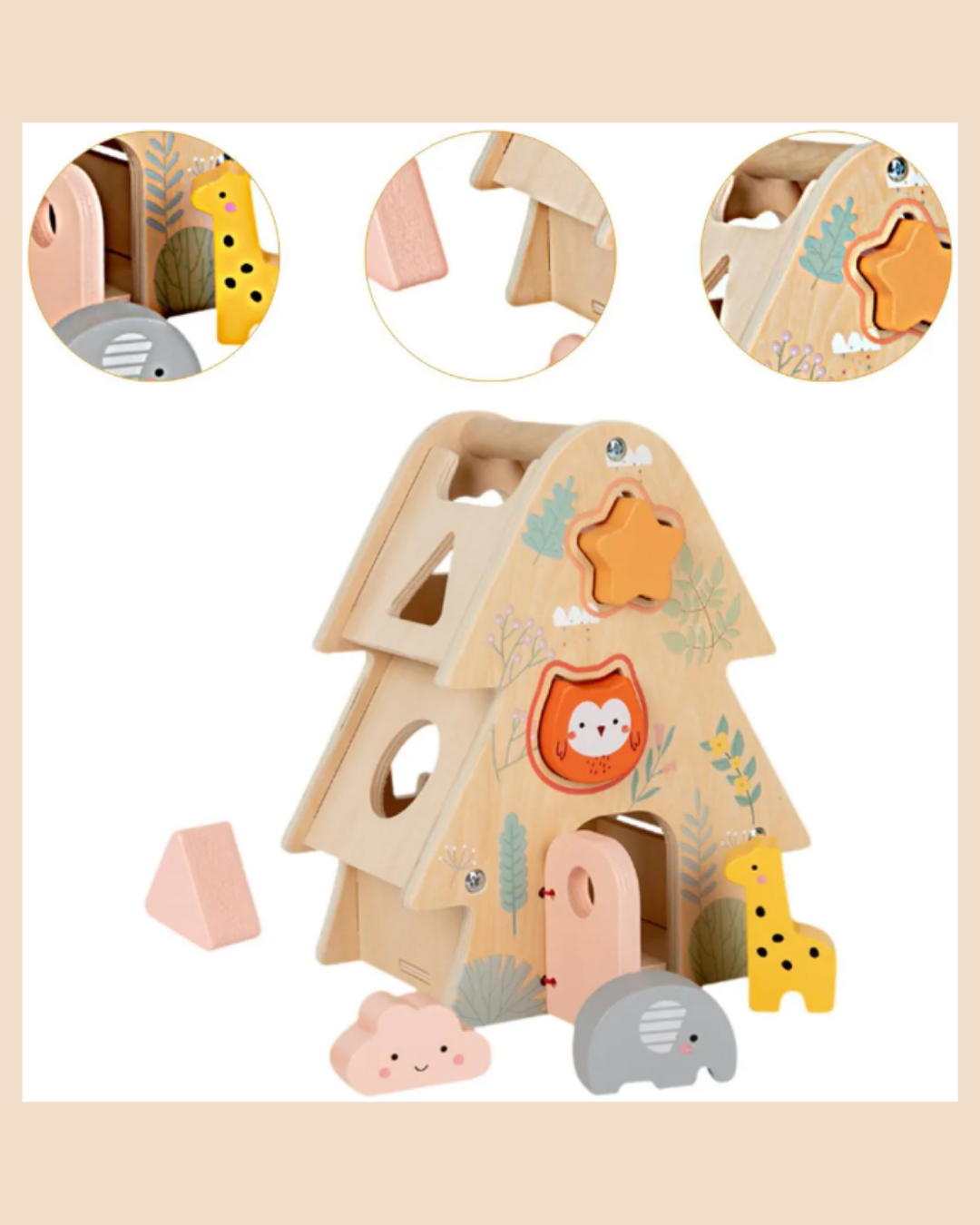 Onze Wild & Little Vormenboom is een klassiek houten speelgoedbox met 9 verschillende vormen die elk hun eigen plekje zoeken. Je kleintje trekt de deur open, sorteert op kleur en vorm, stapelt ze op elkaar en leert spelenderwijs logisch denken - zonder druk, puur door te doen.